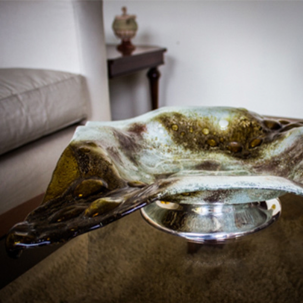 Centro de mesa pañuelon caramelo diseñado y trabajado con pigmentos en colores blanco y caramelo.