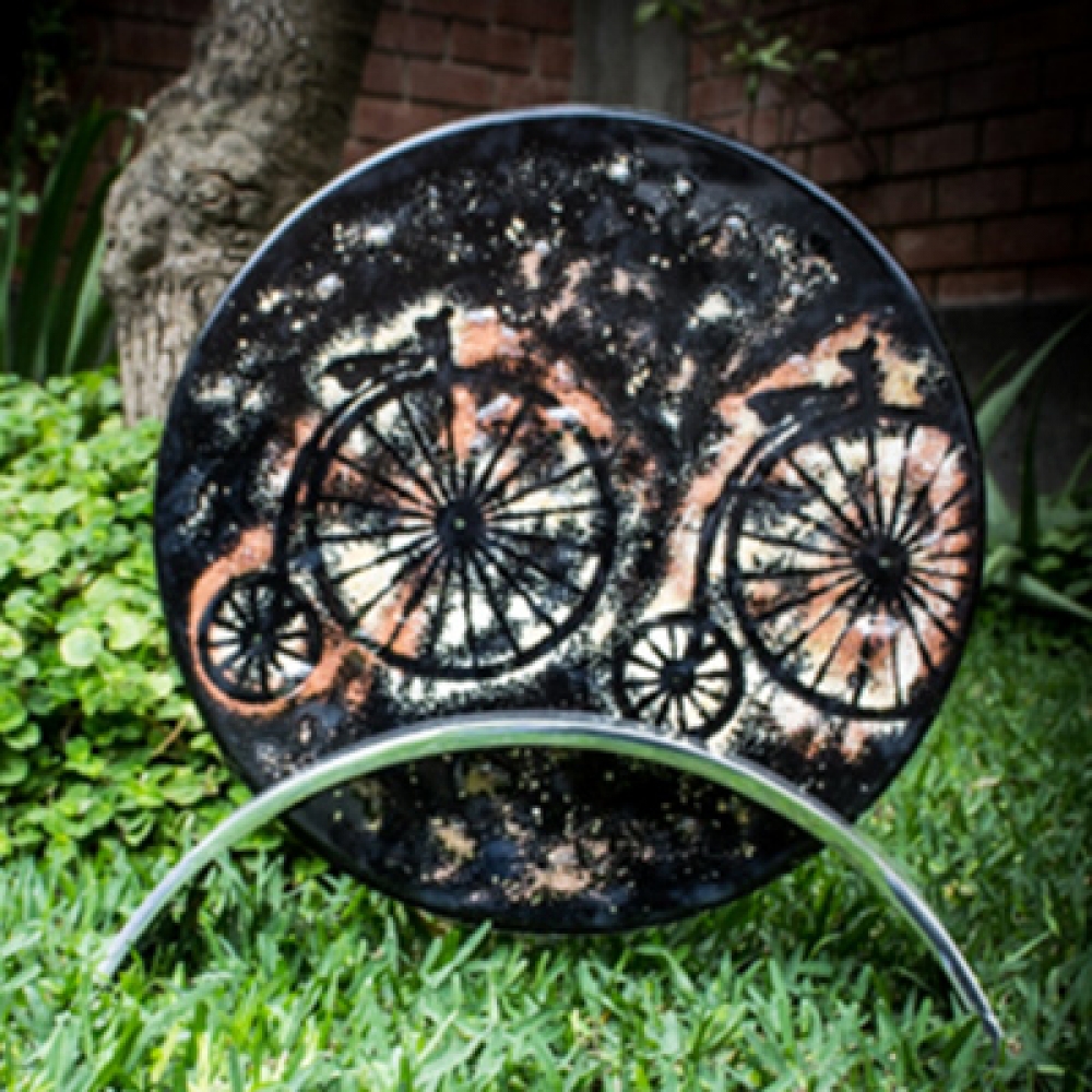 Escultura bicicleta, trabajadas en colores negro, y dorado, se apoya en una base de peltre.