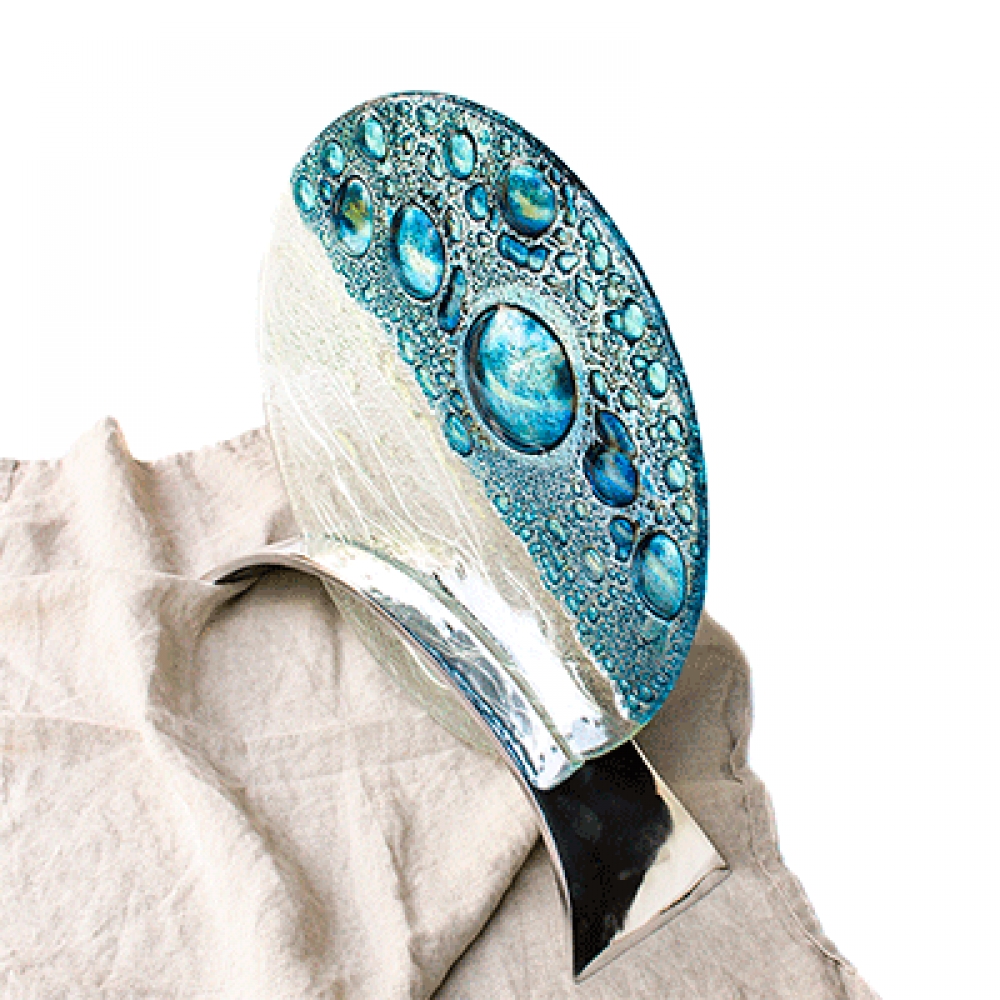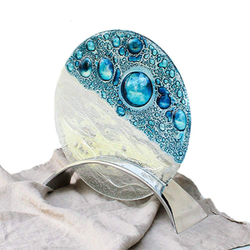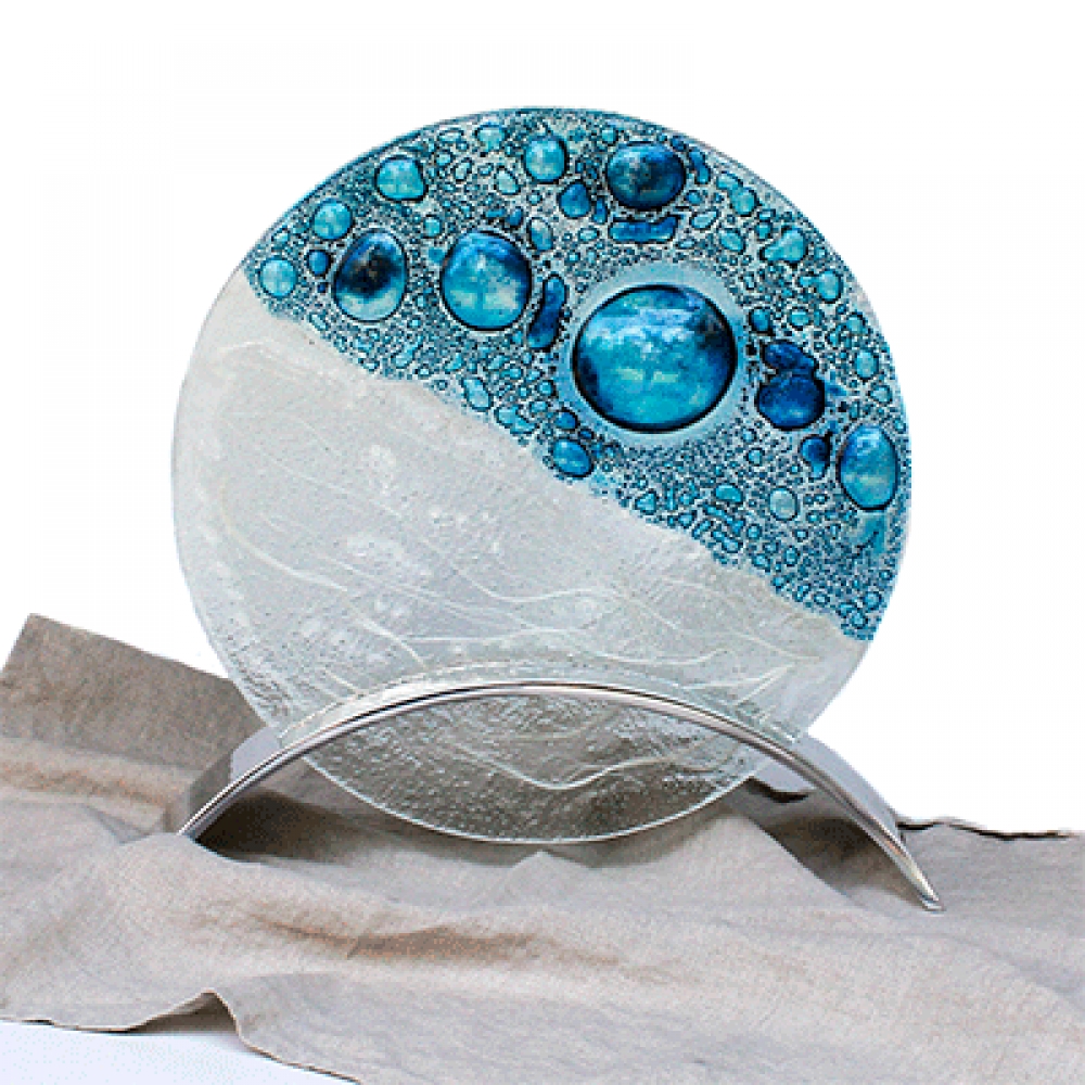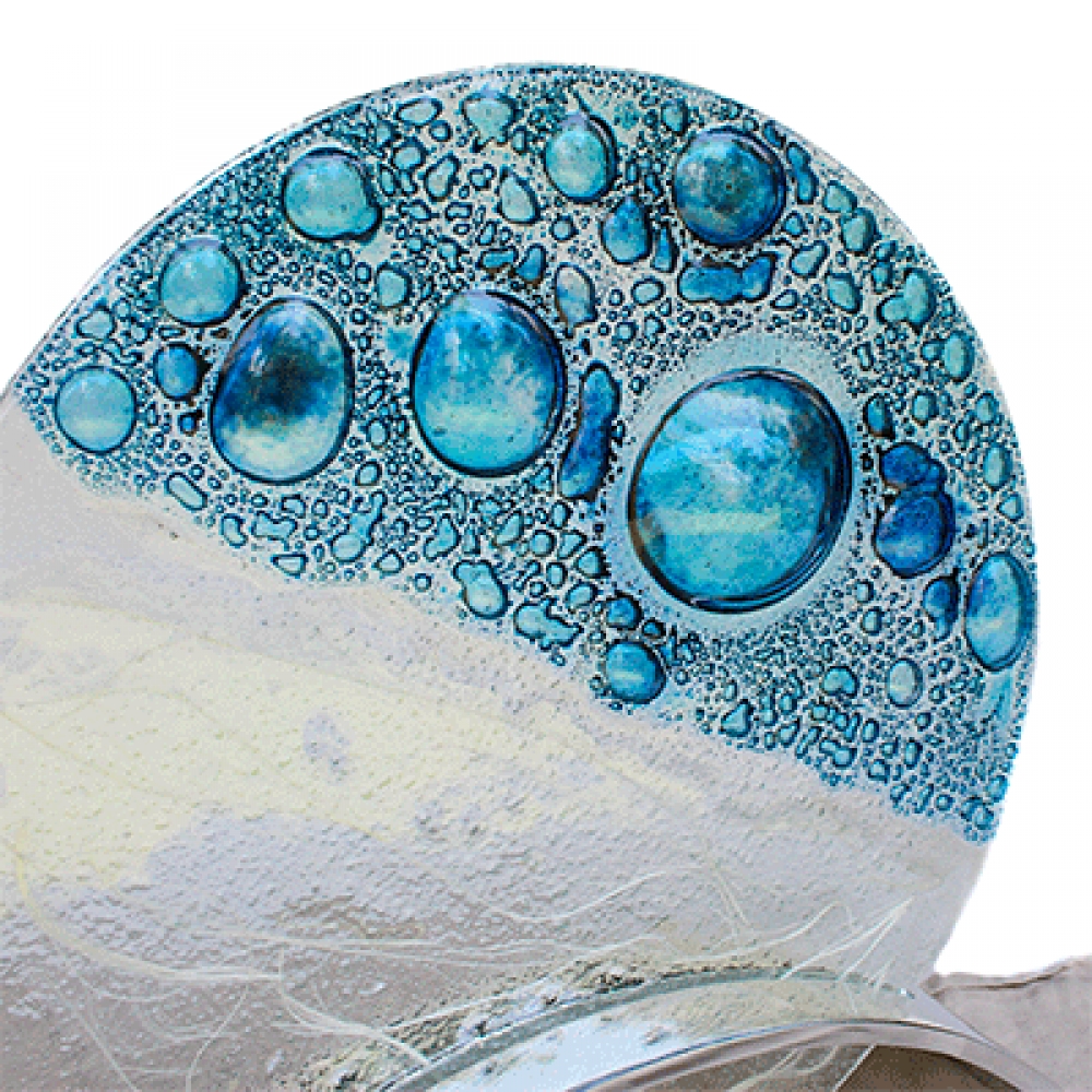 Escultura burbujas azuladas, la trabajamos en gama de azul y turquesa, el tamaño de las burbujas varia de pieza en pieza, se soporta en una base de peltre.