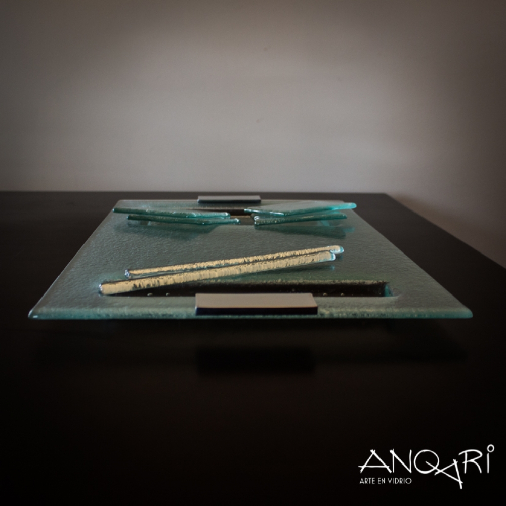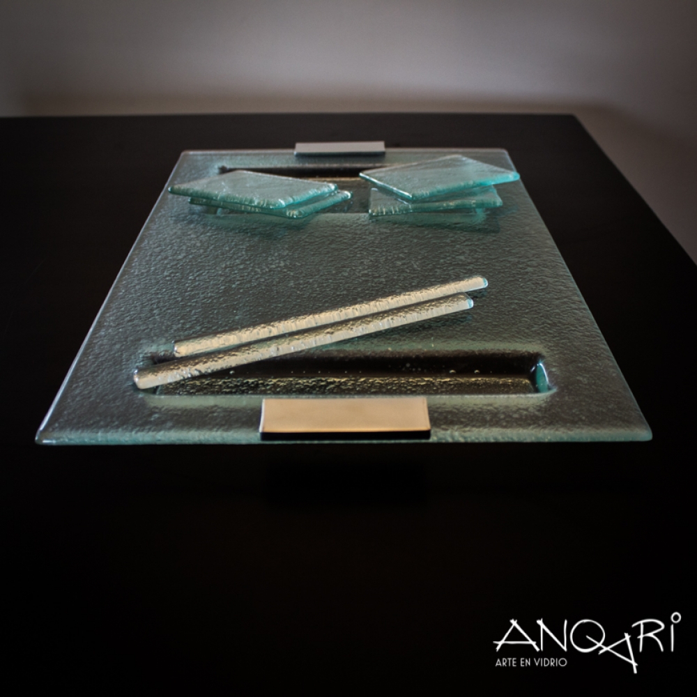 Bandeja set bar, diseñada y trabajada en vidrio transparente texturado.