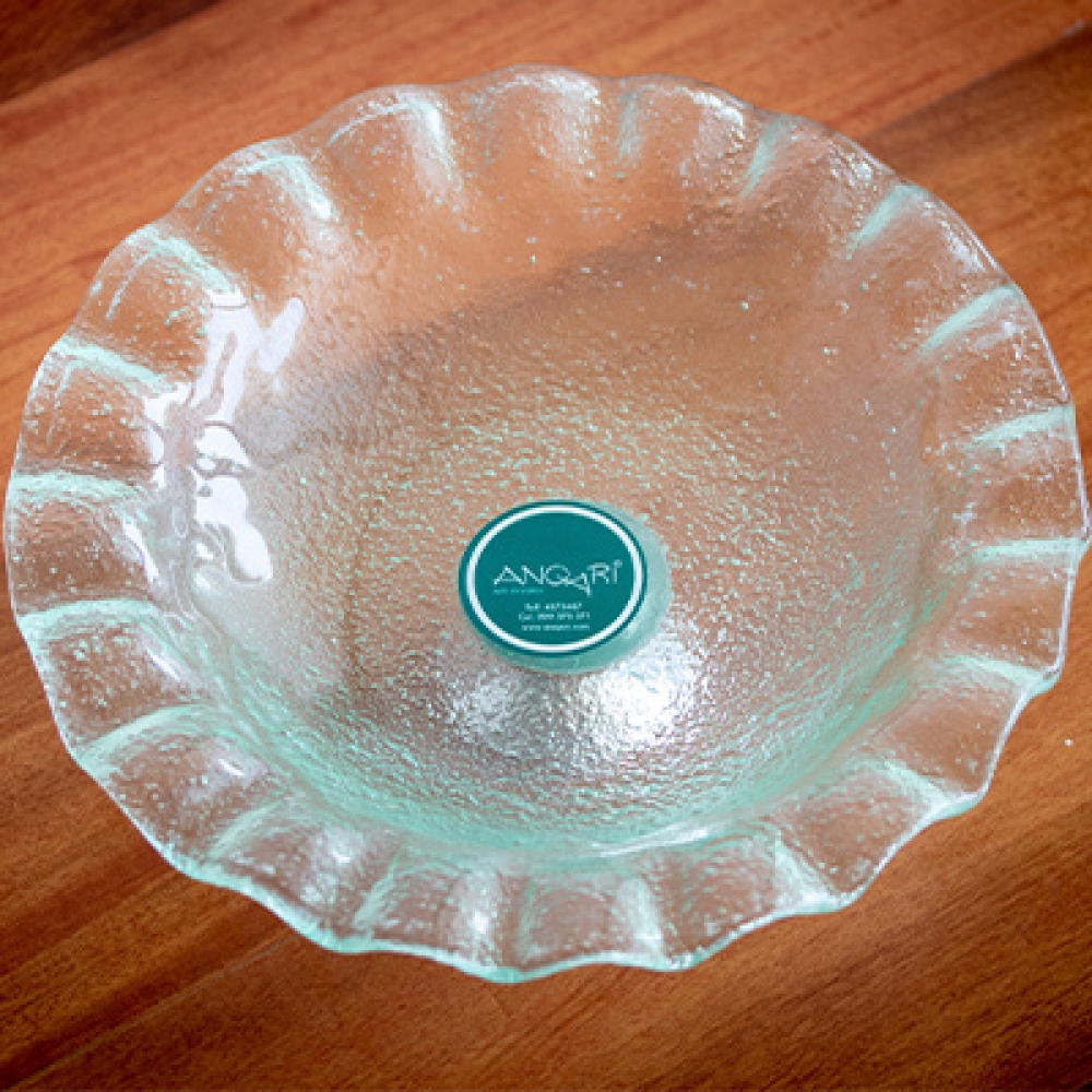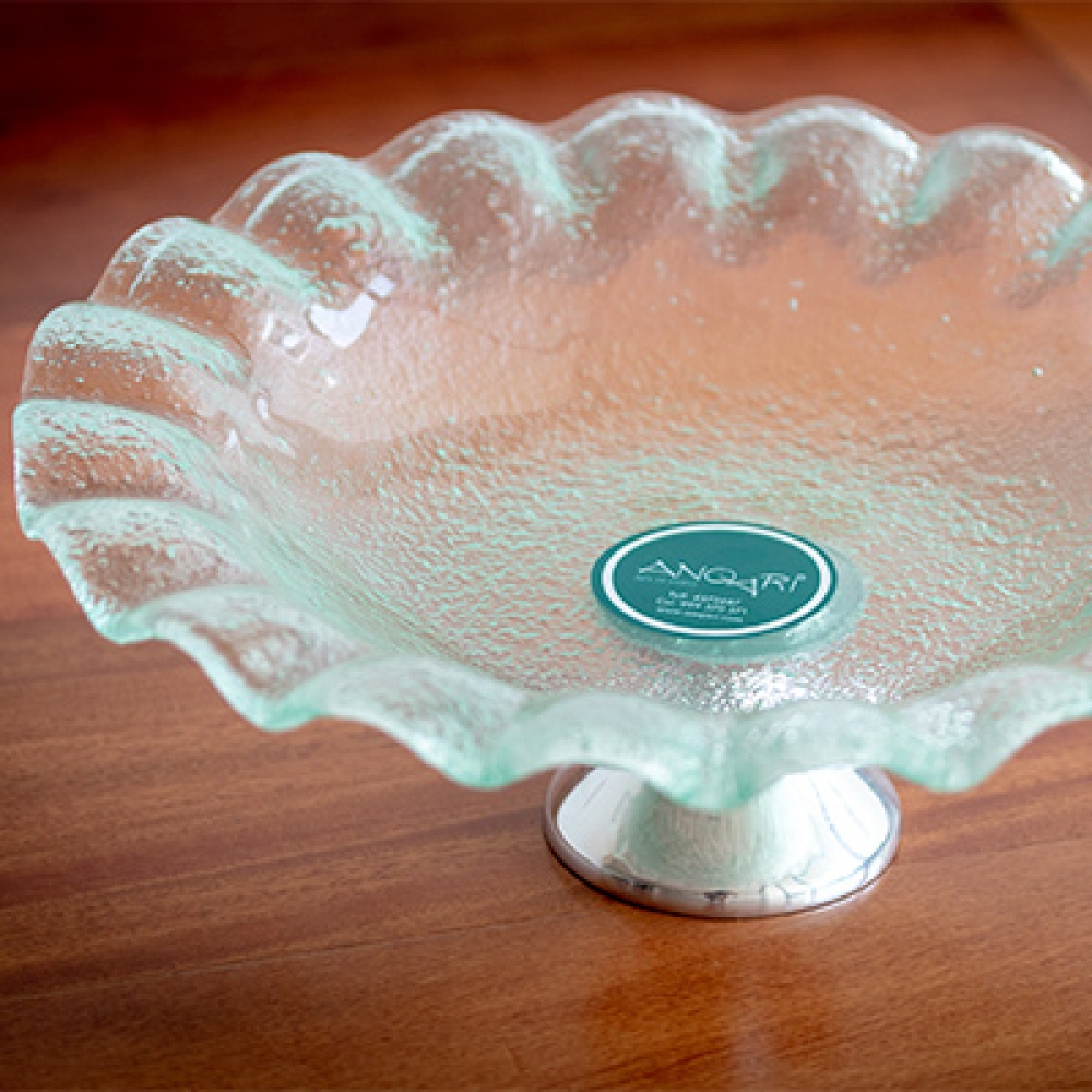 Porta bocaditos circular trabajado en vidrio transparente texturado con base de peltre.