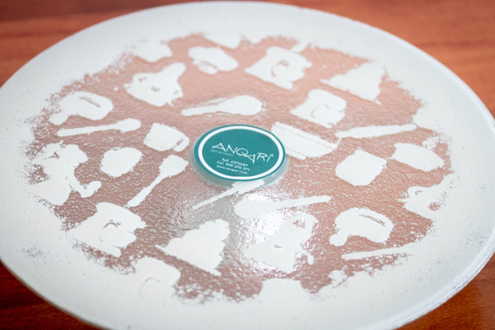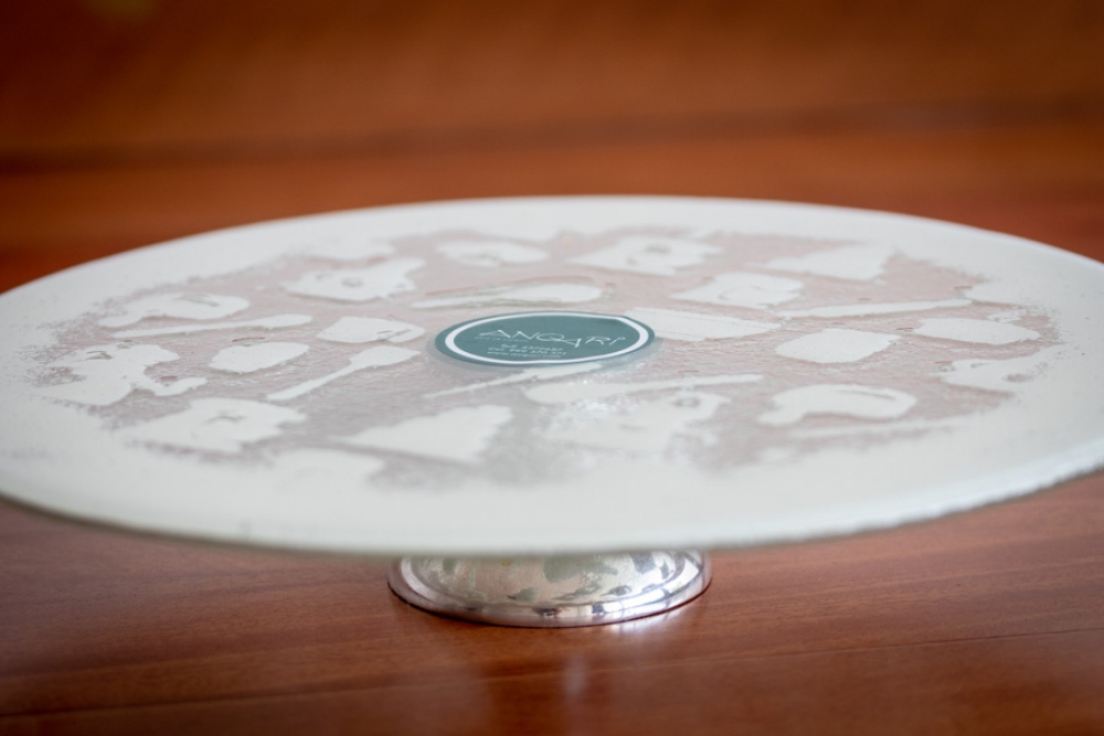 Porta torta circular Awana, diseñada y trabajada con pigmentos especiales de color blanco, este porta torta tiene una base de peltre.